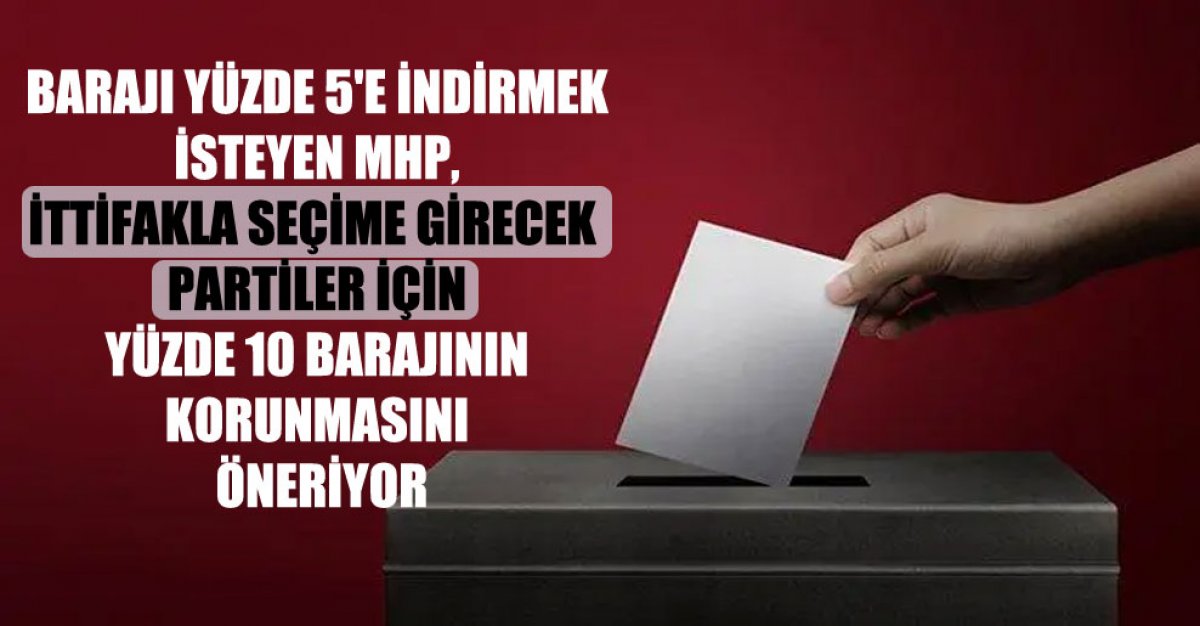 MHP, ittifak içine de baraj getirilmesini istiyor. İttifaksız seçime giren parti için seçim barajı yüzde 5’e indirilirken, ittifak halinde seçime girecek partiler açısından ayrı bir seçim barajı getirilmesi öneriliyor. MHP, ittifak halinde seçimlere giren partiler açısından yüzde 10 barajının korunmasını öneriyor.
