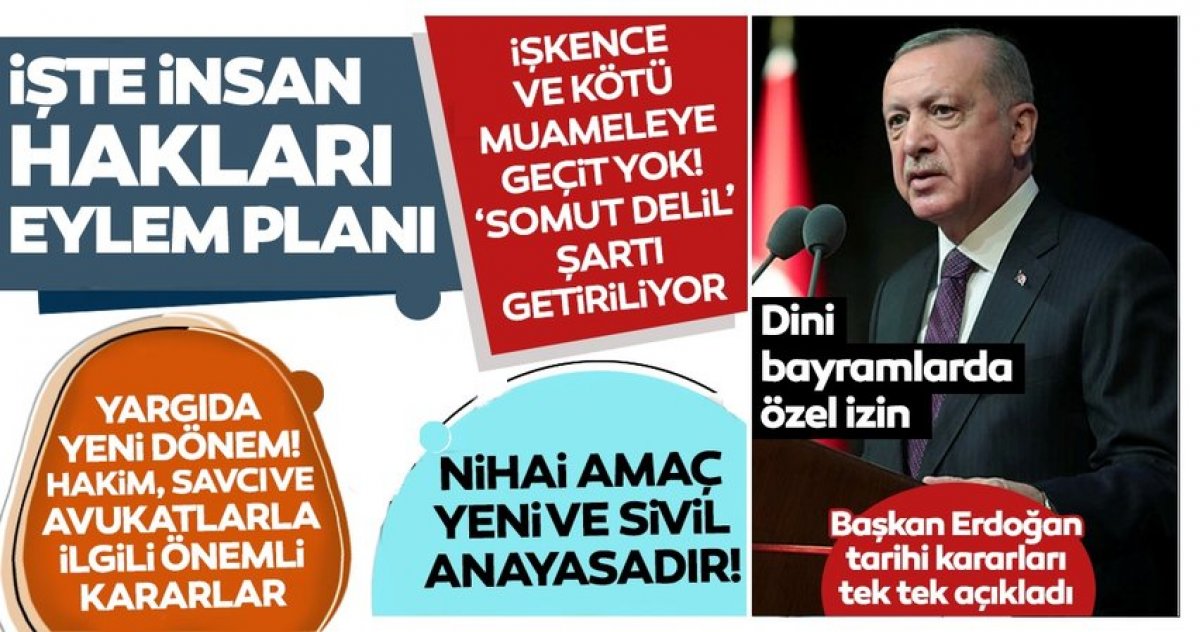 Başkan Recep Tayyip Erdoğan Beştepe Millet Kongre ve Kültür Merkezinde 11 ilke ve 9 amaçtan oluşan İnsan Hakları Eylem Planını açıkladı. Başkan Erdoğan, "İnsan Hakları Eylem Planına ilişkin Adalet Bakanlığı tarafından yürütülen 1,5 yıllık hazırlık sürecinde, toplumun her kesimi çalışmalara dahil edildi." ifadelerini kullandı. Başkan Erdoğan, "Her maddenin hayata geçmesi için gereken adımları kararlılıkla atacağız." dedi.
