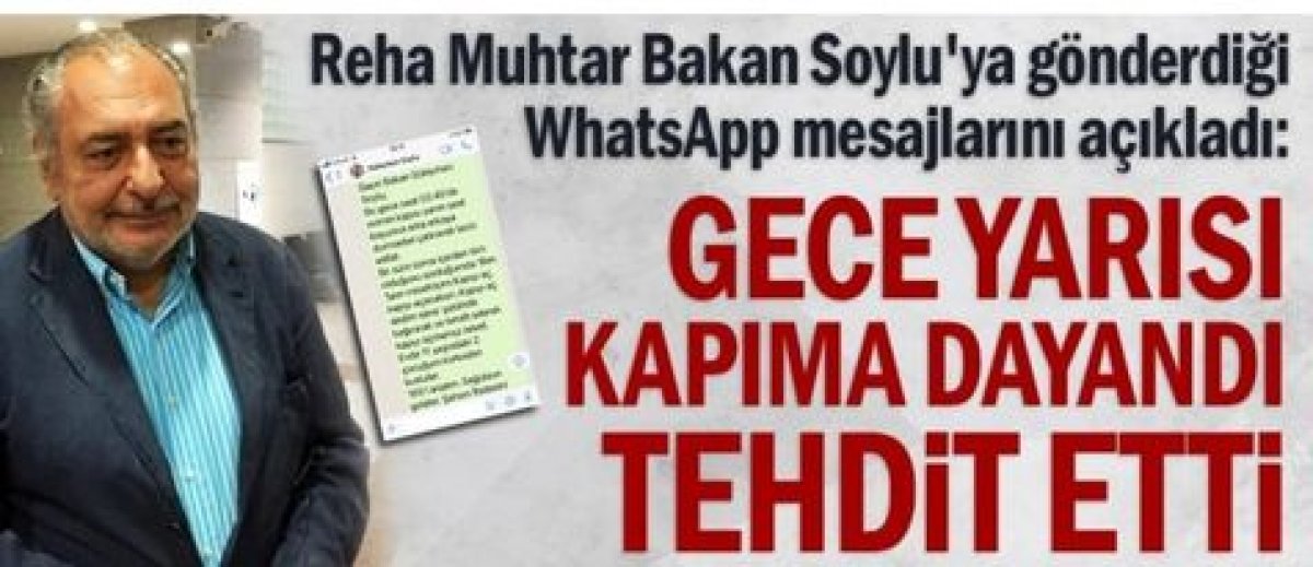 Reha Muhtar Bakan Soyluya gönderdiği WhatsApp mesajlarını açıkladı: Gece yarısı kapıma dayandı tehdit etti Bir dönemin en çok izlenen haber spikeri olan Reha Muhtar, bugün sabaha karşı saat 03:45 sıralarında evinin kapısında tehdit edildiğini duyurdu...
